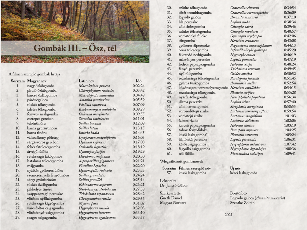 A sorozat harmadik része az őszi és téli gombák világába kalauzolja el a tanulni vágyó gombászokat. Az 59 hazai gombafaj mindegyikét hozzávetőleg egy-egy perces részben, a termőhellyel kezdve, az alaki jellemzők részletezésén át a fogyasztási értékre vonatkozó információkig ismertet. A gombákat Szenthe László gombaszakértő mutatja be. A film alatt az évszakra jellemző természeti hangfelvételek, erdei és mezei madarak éneke hallható.