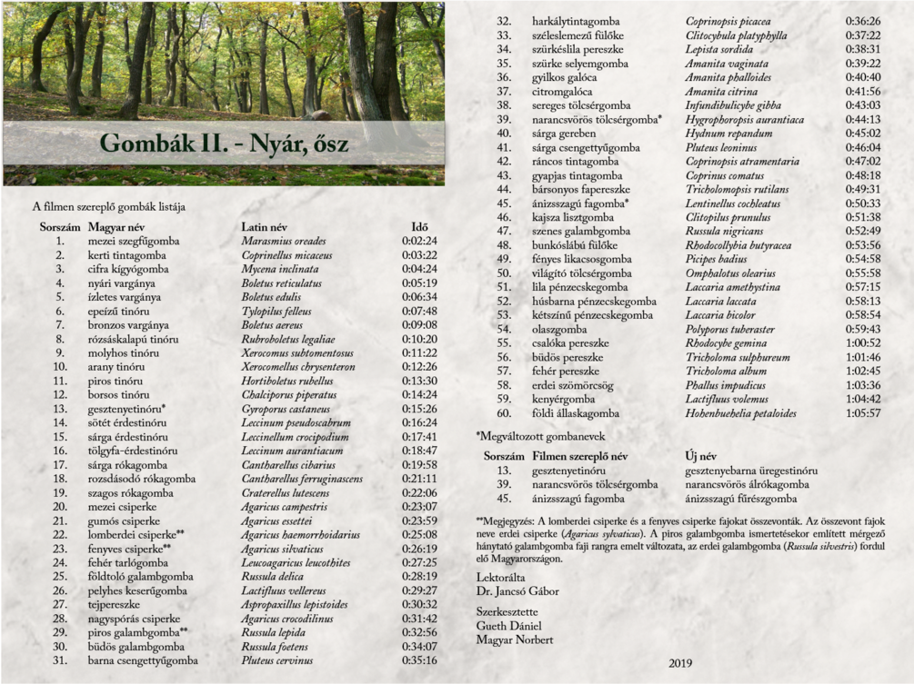 A sorozat második része a nyári és őszi gombáinkat ismerteti. A 60 gombafaj bemutatása a megszokott módon, termőhely - alaki jellemzők - étkezési érték mintáját követve átlagosan egy-egy perces részekben történik. A film alatt Szenthe László gombaszakértő narrációja hallható. A “háttérzenét” az évszakra jellemző természeti hangfelvételek, erdei és mezei madarak adják.